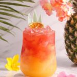 - Add Juices: Pour in the mango juice or puree, pineapple juice, and coconut water into the glass over the ice.